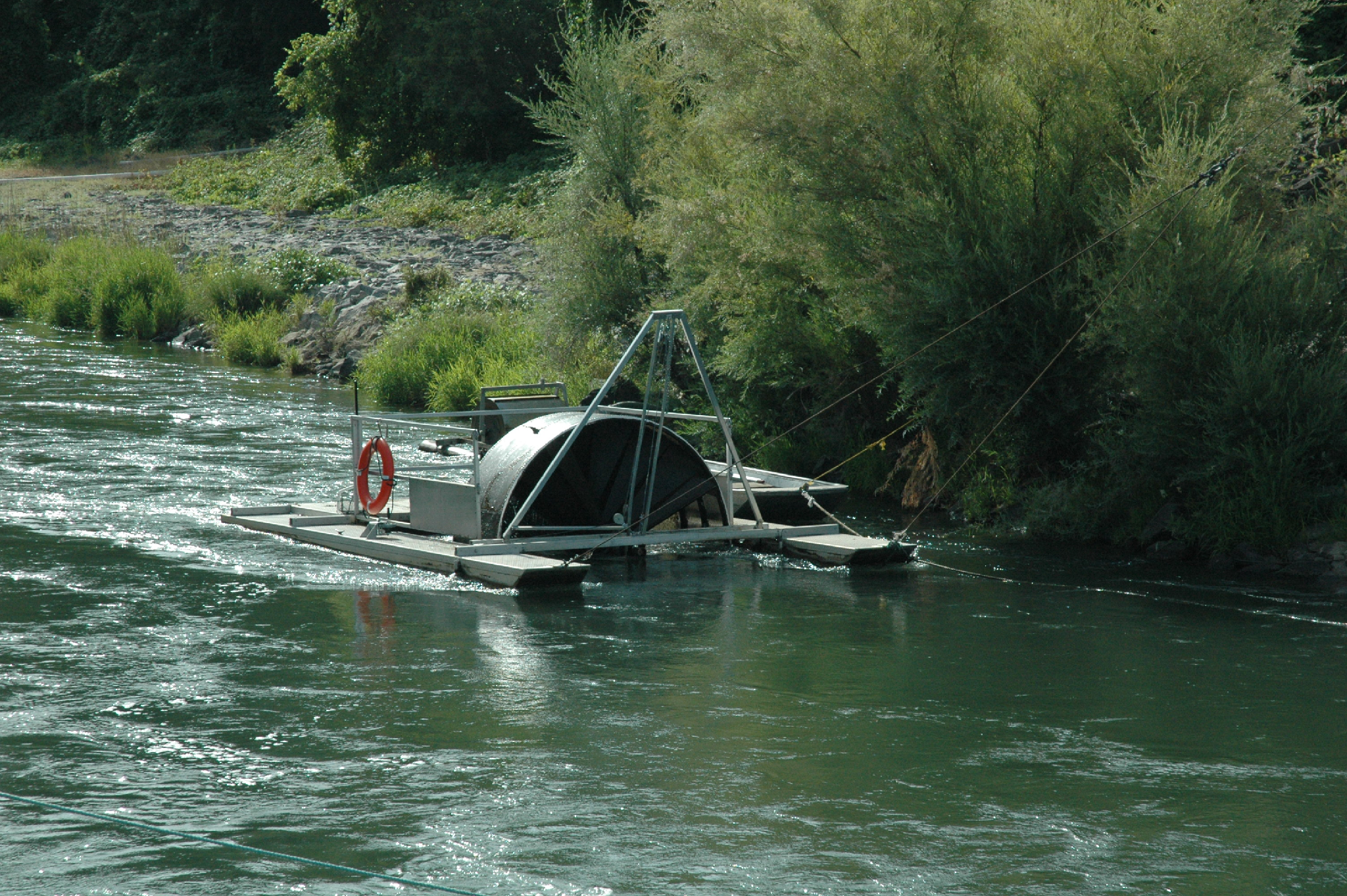 The sampling is conducted using an eight-foot rotary screw trap (RST), with a live box, in the center of GCID’s bypass channel that is approximately 68-feet wide at the trap site. The site is approximately 300 feet downstream from the fish screen structure and 100 feet downstream of the water control structure. The RST is anchored by secured steel tower structures on opposite banks of the channel and connected by a high-line stainless steel cable suspended above the bypass channel, with an additional cable that is attached directly to the RST. This configuration provides stability and allows the RST to be operated during fluctuating flows throughout the year, especially during the winter months.